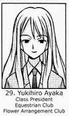 Ayaka's roommates are Chizuru, Natsumi, and later Kotarō (whom Chizuru introduced to her as Natsumi's little brother), and is in the equestrian and flower-arranging clubs. Even though Ayaka is a rich man's daughter (her family owns a zaibatsu/konzern), it has not stopped her from being well-versed in several unnamed martial arts, culminating in having a "ryuha" of her own (Yukihiro Ayaka-ryū). Her affection toward Negi increases substantially after witnessing his performance during the Mahora Fighting Tournament and learning about his missing father. While on the outside, she may appear to be a typically spoiled brat she is really a warm-hearted, kind and caring person who wants to help Negi as much as she possibly can. She even helped him to get back on good terms with Asuna when the two were briefly avoiding each other. She and several of the girls in the class have vowed to aid Negi in his quest to find his father, though Ayaka has proven to be the most sincere in this case.