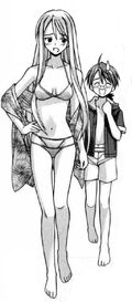 Ayaka attaches herself towards Negi from the moment he arrives in 2-A, obsessively trying to win over his favor while representing the class as their iincho. While this could be seen by many as Ayaka's courtesy for the new teacher, Asuna sees this as part of a trap by her to seduce Negi and make him her own. Throughout the first few months of Negi's stay in Japan, Ayaka attempts several times to both win Negi's favour or to have some time alone with him, including showing off her physical assets in the bath[5], trying to make herself become his partner[6], even inviting him over to her mansion for the day (without knowing Asuna and Konoka would also tag along)[7]. While consistently obsessed in making sure the class reflected well being the iincho (including in testing[8] and in the class dodgeball game [9]), most of Ayaka's inspiration for battle appeared to be just as much about class pride as it was about winning Negi.