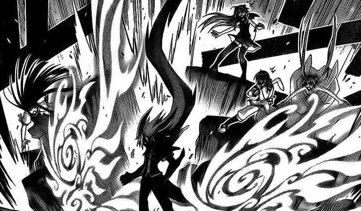 They test each other's power with one attack after another. Negi then gets caught within Fate's Senjin Kokuyouken, but blocks and deflects each blow until he breaks out of it.