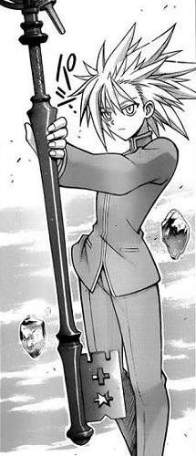 He first appears in chapter 311 in the manga, where he hits Nodoka with a lightning spell and seizes the Great Grandmaster Key. He subsequently defeats Kaede (albeit she manages to retrieve the Key), Kotarou, Asakura, Yue, and Makie, before encountering Fate "Tertium" Averruncus. In the following fight, he has the upper hand for a while, but is defeated with a powerful punch that made a huge hole in his left side and blew his arm off.