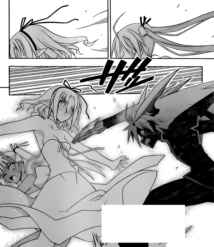 However, before Negi can deal the final blow, Shiori reverted back into her regular form and, trying to stop the corruption from the Magia Erebea, took the attack that was intended for Dynamis. Luckily, she was only grazed and Konoka was able to heal her, although the attack resulted in Negi going into an unconscious state.