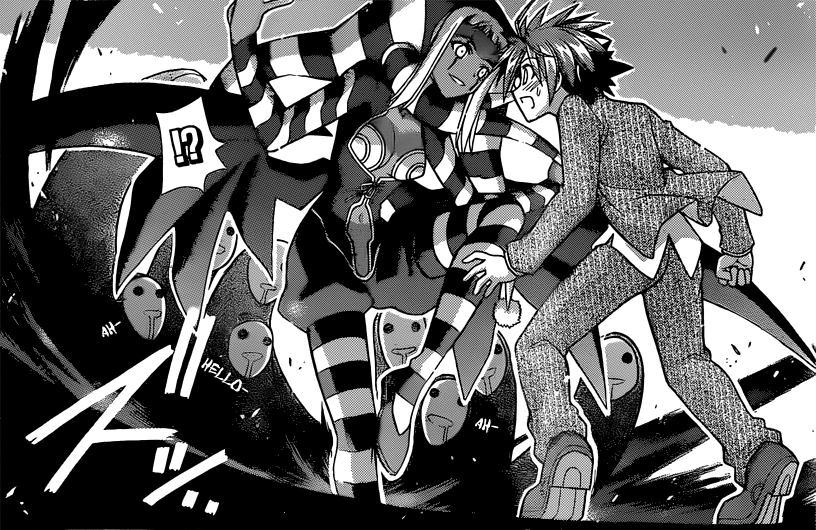 After Negi states that he has a solution to halting the deterioration of the magical world, Poyo reveals her true form: that of a high member of the demonfolk clan. She grows two sets of horns from her head and a giant demonic silhouette that is capable of firing powerful beams of energy. Mana and Keade manage to block her attack right before the gravity mines (provided by Chao) the sniper planted activated and smashed the high demon through the floor. Mana dives after her, knowing that Negi needs to conserve his strength. As the two plunge, Mana reveals her own trump card: Time dilation bullets and her own half demonfolk blood (that is the source of her abilities.)